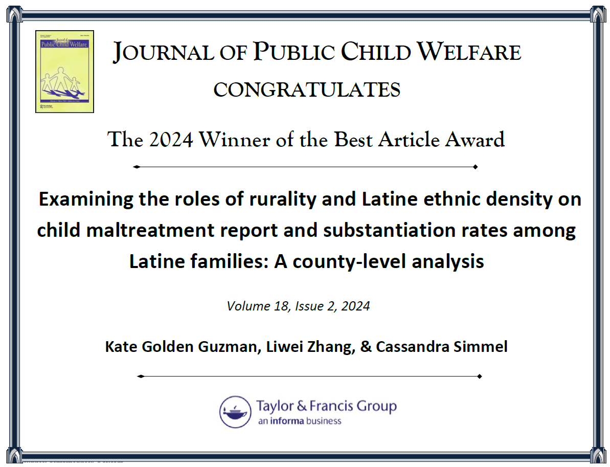 Golden Guzman, K., Zhang, L. & Simmel, C. (2024) Examining the roles of ethnic density and rurality onmaltreatment referral and substantiation rates among Latine children and youth: A county-level analysis. Journal of Public Child Welfare.